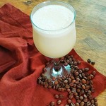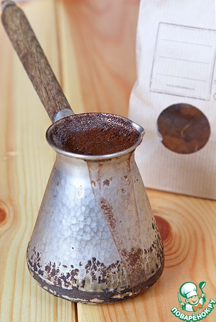 Второй обязательный ингредиент - кофе. Принципиально можно использовать любой кофе - сваренный в турке, кофемашине, гейзере или даже растворимый. У меня - турка. Варим кофе любимым способом (я насыпаю примерно 2 ч. л. на порцию кофе в 150мл, даю поднятся шапке три раза, после чего убираю с огня и даю немного постоять). Кофе хорошо бы дать остыть, или можно добавить туда немного льда. И обязательно при необходимости отфильтровать напиток с помощью марли или ткани, взвесь здесь совсем не нужна!