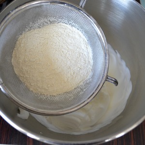 Добавить просеянную муку и осторожно перемешать лопаткой плавными заворачивающими движениями, чтобы не было комочков. Тесто получается очень нежной и гладкой консистенции.
