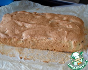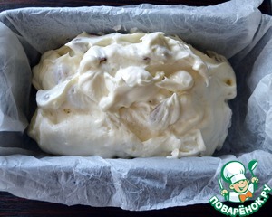 Форму для выпечки кексов (20х10 см) проложить пекарской бумагой, предварительно смоченной в воде и как следует отжатой от лишней жидкости. Выложить тесто в форму и разровнять. Высота теста в форме должна быть примерно 3 см.