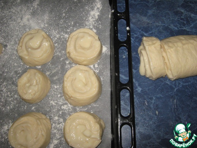 Нарезать на кусочки толщиной примерно 3 см. Выложить на противень, застеленный пергаментом и слегка присыпанный мукой. Если есть прямоугольная форма с высокими бортиками, то лучше булочки выпекать в ней, они будут "расти" вверх.