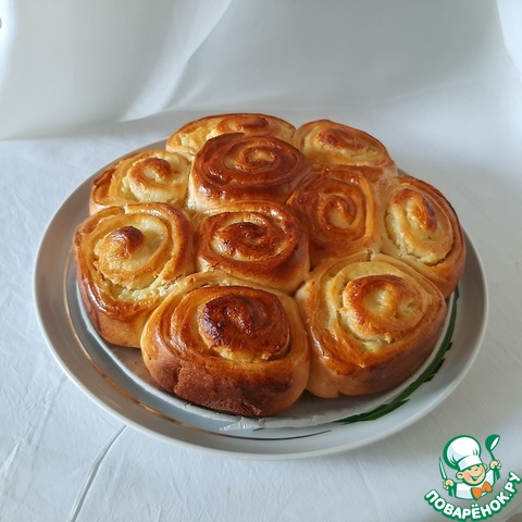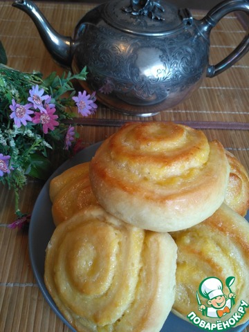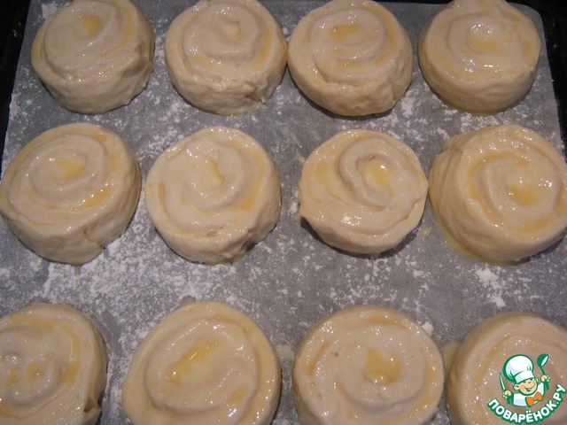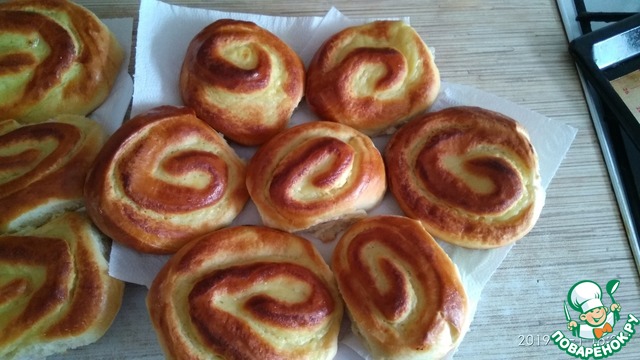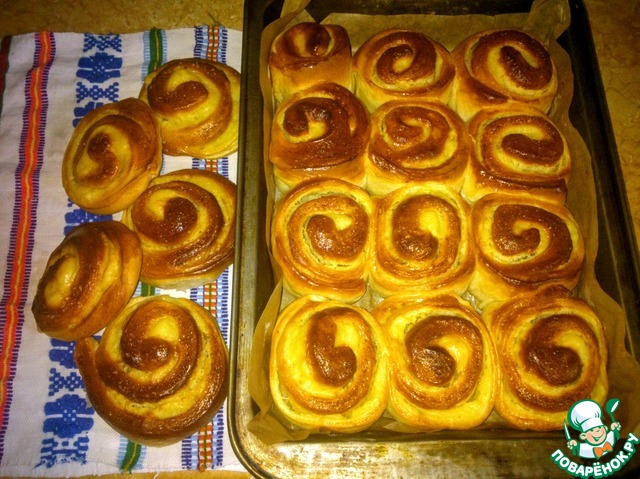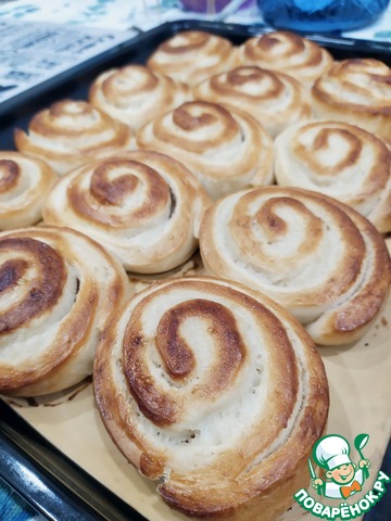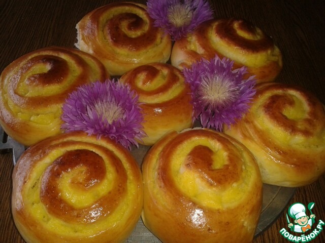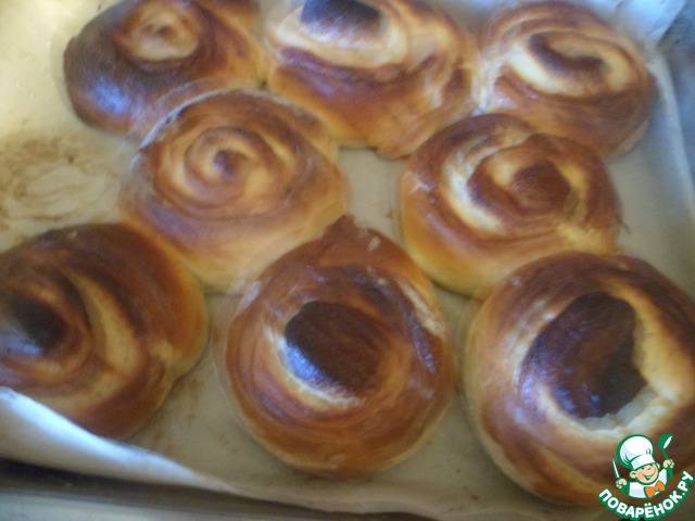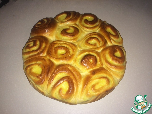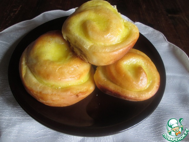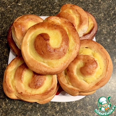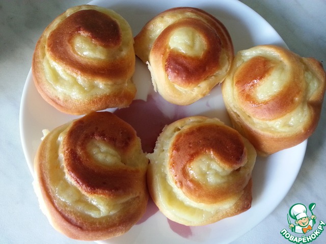 С готовкой особых проблем не возникло. Тесто замесила легко, для раскатывания поделила на 2 части, потому что его было довольно много. Заварной крем делала в микроволновке, а не на плите. Обычно по другому рецепту готовлю и с ним все гладко проходит, а в этом варианте как-то быстро образовались комочки, пришлось погружным блендером перебивать, но по вкусу хороший. Сложно было удержать его внутри булочек во время нарезания из рулета - выдавливался, разъезжался край, но с этим тоже справилась.