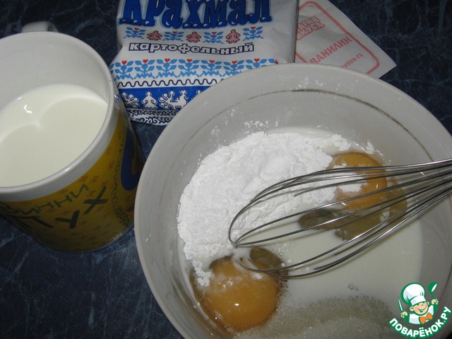 Сварить заварной крем - соединить сахар, крахмал, яйца, ванилин и 50 мл. молока. взбить венчиком.