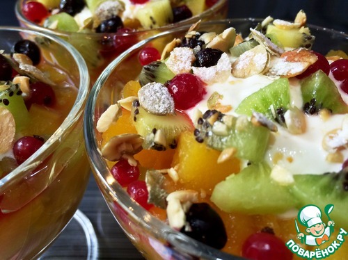 Сверху положить сметану. Украсить десерт по своему вкусу и фантазии. Я добавила кусочки киви, ягоды красной и чёрной смородины, посыпала тыквенными семечками и сахарной пудрой, подавала охлаждённым.