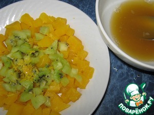 Нарезать киви кубиком, натереть цедру лимона 0,5 ч. л., добавить к тыкве. И влить сироп, перемешать.