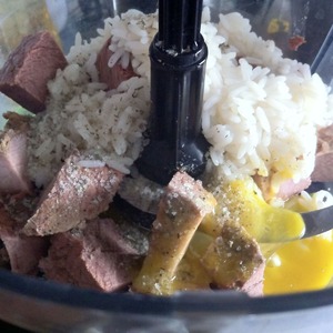 Мясо измельчить в блендере с рисом и желтками. Посолить и поперчить по вкусу.