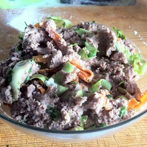 Белки взбить до устойчивой пены и аккуратно вмешать в мясную массу. Затем добавить обжаренные овощи и нарезанную петрушку.