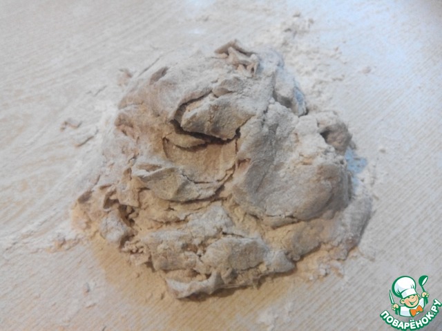 Когда тесто будет становиться густым выкладываем его на стол и начинаем вымешивать понемногу добавляя пшеничную муку. Тесто получается немного необычным, слегка липким и напоминает мягкий пластилин!)