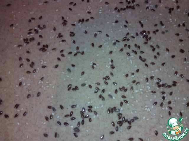 Я посыпала тесто семенами льна и кунжутом, можно посымать тмином, на вашу фантазию))