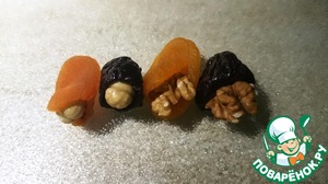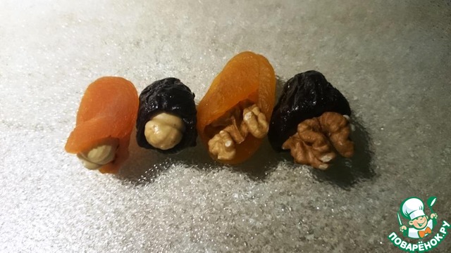 • Далее помещаем пять грецких орешков в курагу и пять - в чернослив, то же проделываем с фундуком.