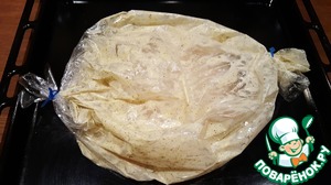 Добавить в пакет мацони и хорошенько аккуратно потрясти. Включить разогрев духовки 200*. Пока духовка прогревается утёнок немного помаринуется.