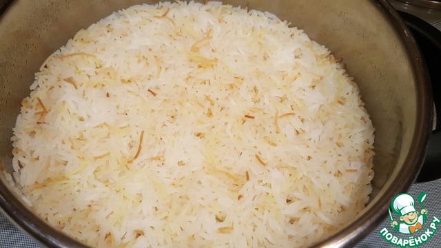 Обжарив до такого состояния рис с вермишелью, сдвиньте кастрюлю на соседнюю комфорку или выключите плиту. -