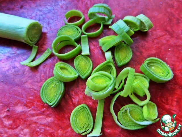 • Лук-порей покрошить мелко. Можно и без него обойтись. Или взять другую зелень.