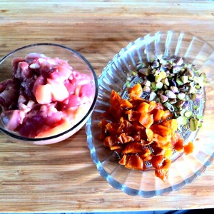 Курицу нарезать довольно мелкими кусочками. Нарубить фисташки и курагу.