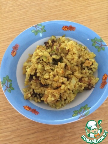 Добавить куркуму, кориандр, перец и корицу, а через минуту курицу, курагу и фисташки. Обжарить пару минут. Фисташки я использую соленые, поэтому дополнительно не досаливаю. Вы регулируйте количество соли по своему вкусу.