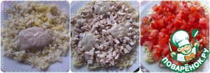 Курицу необходимо отварить. Нарезать мелким кубиком.