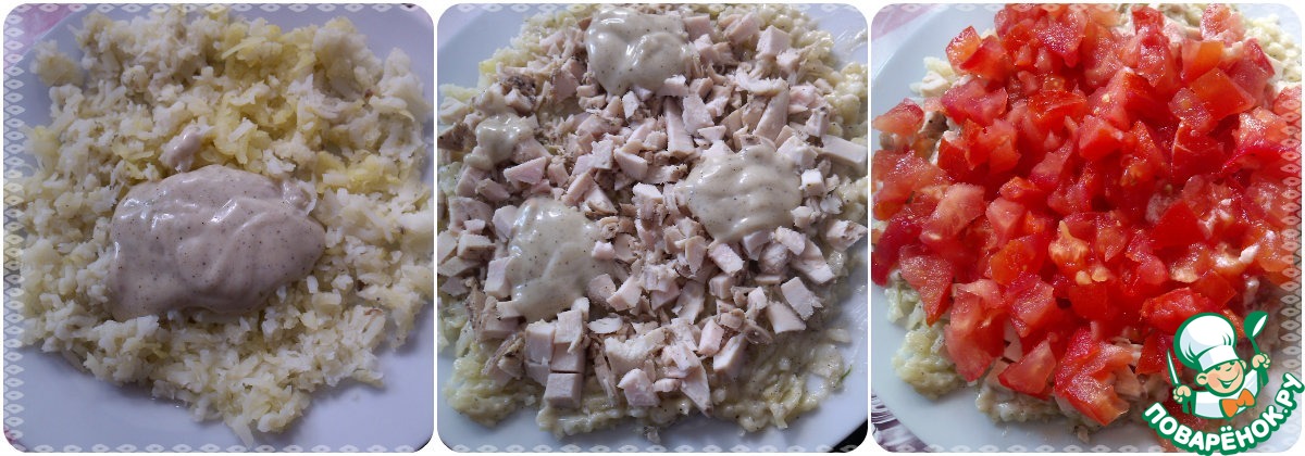 Все последующие слои я майонезом не промазываю. Лично нам достаточно сока от помидор - салат и так получается сочным и пропитанным. Вы же, можете немного смазать соусом и/или подсолить.
