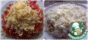 Как писала выше, твердый сыр можно заменить на плавленный - будет еще нежнее. Но с твердым сыром более пикантно. К тому же, слой томатов я не солю (опять же, из-за сыра).