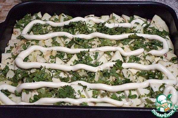Затем – снова фарш, картошку, солим и перчим, выкладываем майонез и отправляем в разогретую до 200 градусов духовку минут на 20.