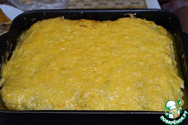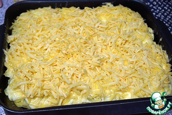 Через 20 минут противень вынимаем, присыпаем все тертым сыром и снова в духовку минут на 20-25.