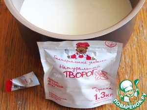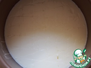 Далее сгусток подогреть до температуры 50-60°С в той же емкости (очень удобно это делать в мультиварке на режиме "подогрев" или "отваривание"). «Отваривание» производят в течение 10-15 мин. (начнет активно отделяться сыворотка и сжиматься сгусток).