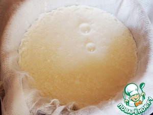 Далее сгусток фильтровать через чистую марлю в несколько слоев (или лавсан, или бязь). Подвесить сгусток в марле для свободного выхода влаги. Лишнюю влагу можно удалить с помощью подпрессовки сгустка тяжелым предметом. Готовый продукт переложить в отдельную емкость, охладить в холодильнике не менее 2 часов. Из полученного творога я буду готовить творожно-сырный пирог с шампиньонами.