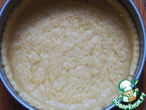 Тесто распределить в разъемной форме (диаметр 20 см), застеленной пергаментом и смазанной растительным маслом, сформировав бортики. В тесте сделать частые наколы вилкой, чтобы при выпечке оно не вздувалось. Отправить в духовку, заранее разогретую до 180 гр., на 10-15 минут до легкого румянца.