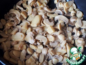 Консервированные шампиньоны обжарить на оливковом масле до золотистости. Несколько кусочков я оставила для украшения.