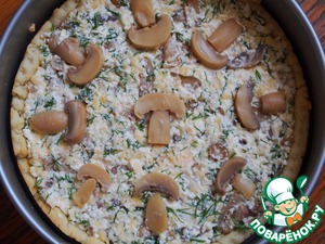 Песочная основа отлично сочетается с творожно-сырной начинкой, образуя интересную вкусовую композицию, которую прекрасно дополняют шампиньоны