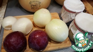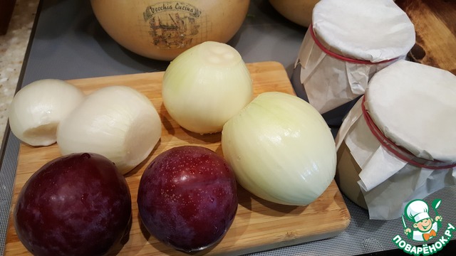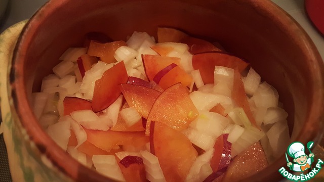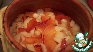 Нарезать мелко лук. Налить в горшочки масло, выложить лук. Тонкими ломтиками нарезать сливы и смешать с луком. Слива даст небольшую изысканную кислинку блюду и немного сладости.