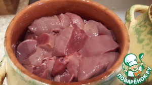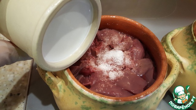 Печень нарезать на достаточно крупные кусочки. Разложить по горшочкам.
