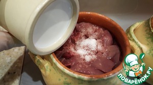 Посолить по вкусу. Сверху выложить мацони и отправить горшочки в разогретую духовку на 1 час.