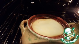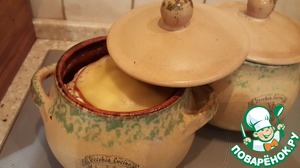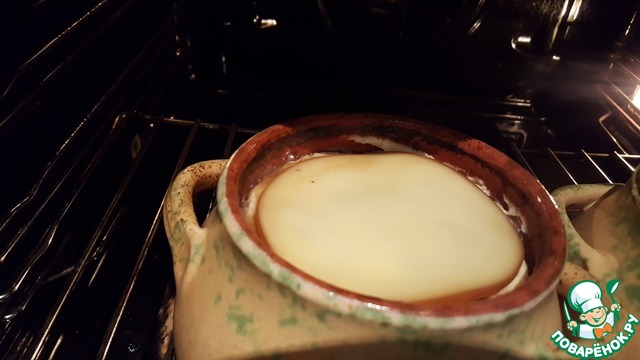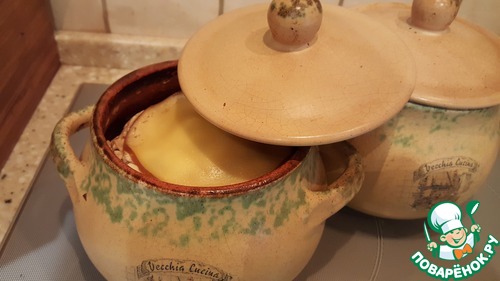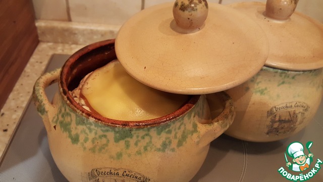 Я решила придать блюду лёгкий аромат копчения, добавив за 10 минут до готовности по кружочку колбасного сыра в каждый горшочек.