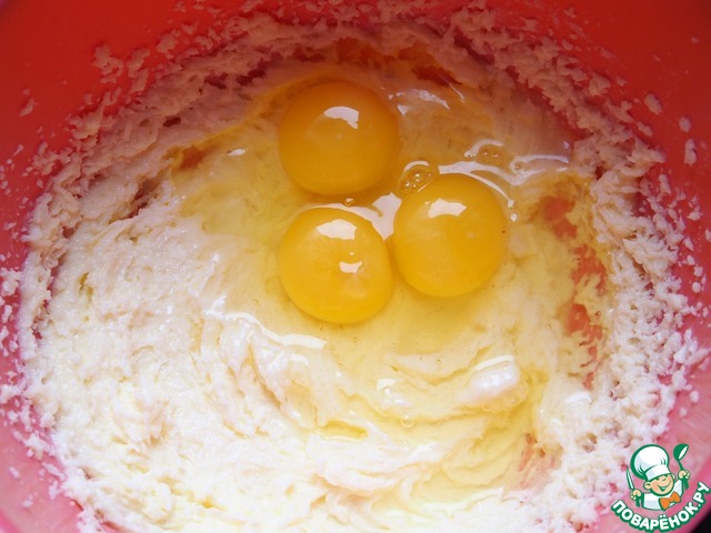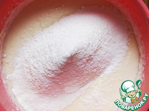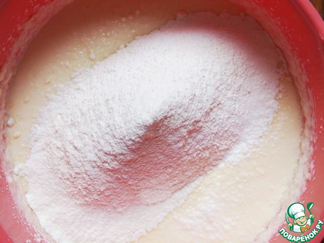 Частями просеять муку с разрыхлителем. Хорошо перемешать, чтобы не было комочков.