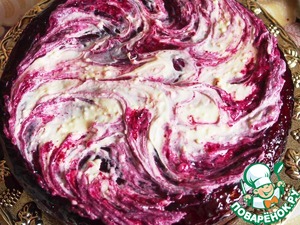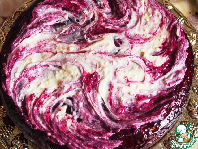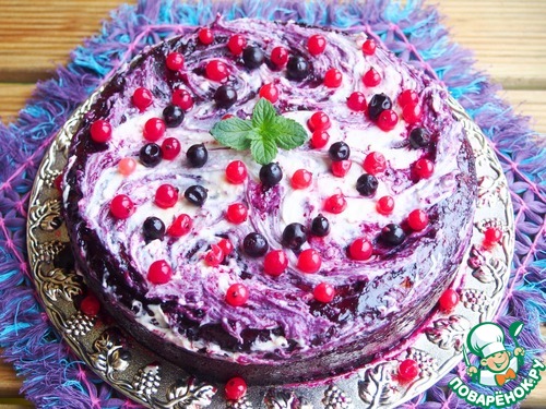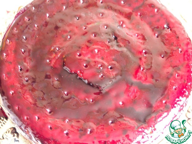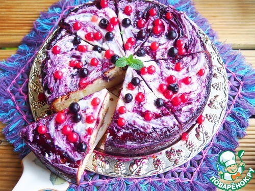 Поверх пирога я нанесла растопленный белый шоколад и украсила ягодками красной и черной смородины.