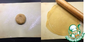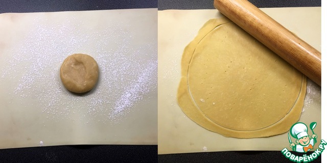 Силиконовый коврик немного посыпаем мукой, раскатываем 1 часть теста. При помощи тарелки (у меня D=20 см) вырезаем круг. Края теста не убираем, они нам еще пригодятся. Делаем проколы теста вилкой в нескольких местах. -