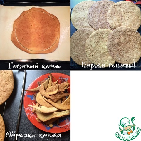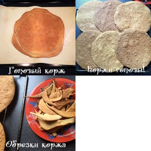 Выпекаем корж 3-4 минуты до красивого коричневого цвета. Готовый корж отделяем от неровных краев, которые складываем в сторону - не кушать, они нам еще пригодятся! Таким образом выпекаем все 6 коржей.
