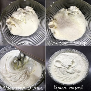 Выкладываем сметанный шар в глубокую стеклянную миску, всыпаем 4 ст. л. сахара. Берем миксер и аккуратно перемешиваем наш крем вначале на низкой скорости, потом на высокой. (Я ставлю миску в раковину, что бы стены были чистыми!) Взбиваем крем до полного растворения сахара 4-5 минут (останавливаясь и давая отдохнуть миксеру). Долго взбивать не требуется, наш крем достаточно плотный и держит форму.
