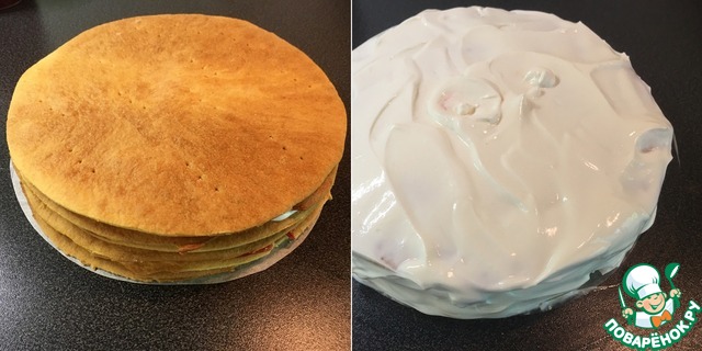 Выкладываем третий корж, смазываем сметанным кремом, и так укладываем все коржи. Последний корж не смазываем. Берем разделочную доску и аккуратно прижимаем торт, что бы крем проник в торт лучше.