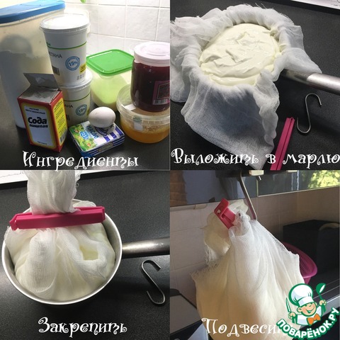 Выкладываем всю сметану в марлю, сложенную в 3-4 слоя. Завязываем края марли и подвешиваем нашу сметанку, подставляем снизу стакан, куда будет стекать сыворотка. Все действие будет продолжаться около 2 часов.