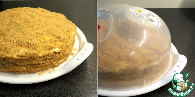 Торт готов, теперь крем должен хорошенько пропитать коржи, накрываем торт колпаком для СВЧ (если нет, можно не накрывать) и убираем в холодильник на 5-6 часов. -