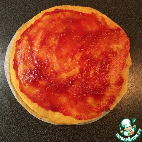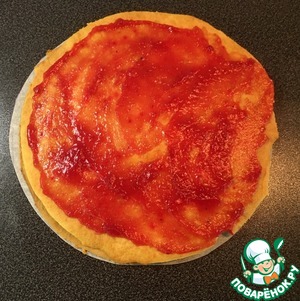 Укладываем второй корж. Только второй корж мы пропитаем джемом.