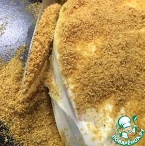 Посыпаем крошкой наш торт, при помощи плоского ножа аккуратно присыпаем (прижимаем) торцевые части медовика. Крошка должная покрыть весь торт, если Вы не пробовали ее во время готовки, Вам хватит!!