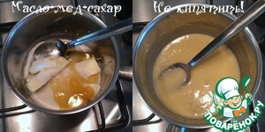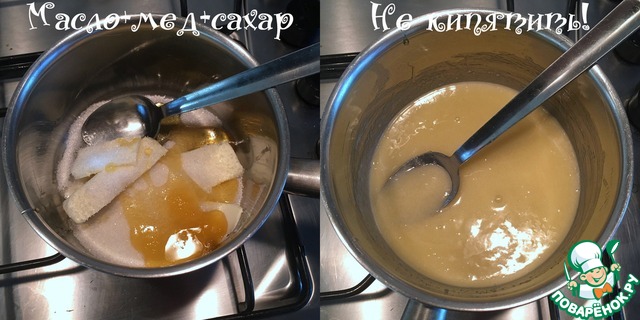 В сотейник выкладываем сливочное масло и подтапливаем его. Добавляем сахар и мед. Перемешиваем до частичного растворения сахара. Не кипятим!!! Просто нагреваем на слабом огне 1-2 минуты. -