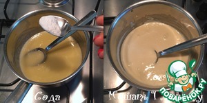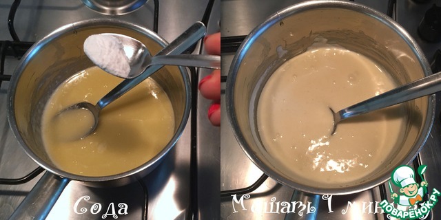 Добавляем соду (не гасить). Перемешиваем. Масса белеет и увеличивается в объеме. Мешаем 1 минуту. Снимаем с огня.