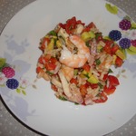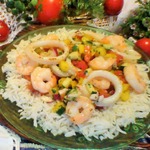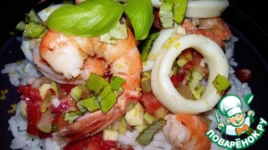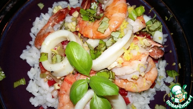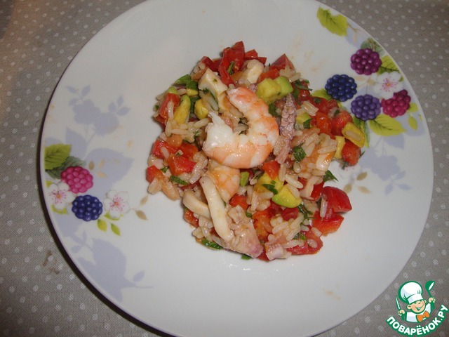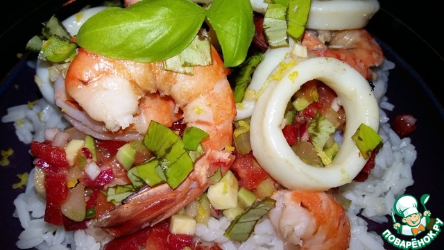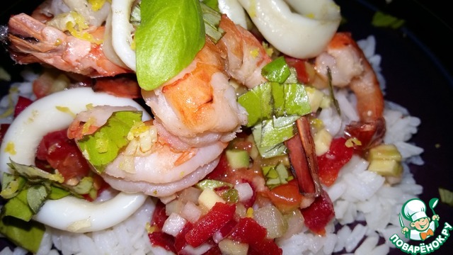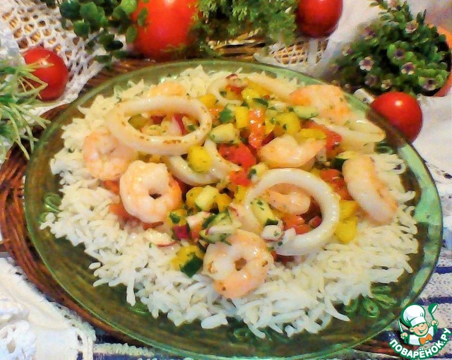На большую тарелку выложить слой теплого риса, распределить по нему сальсу и украсить морепродуктами.