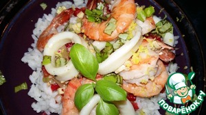 Это наши ингредиенты. Рис /нужен длиннозерный, который не разваривается/отварить в подсоленной воде. Морепродукты отварить в подсоленной и подкисленной воде 1 - 2 минуты, а затем обжарить с мелко рубленным 1 зубчиком чесока в течение 1 минуты.