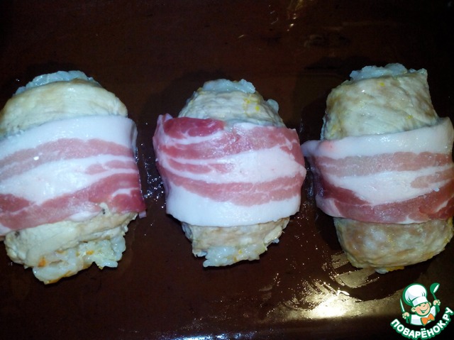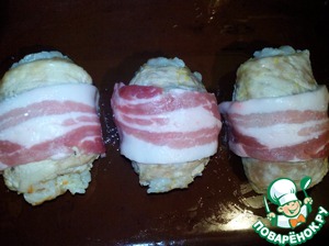 Через полчаса достаем наши рулеты и даем остыть. В это время духовку разогреваем до 200 гр. Разворачиваем фольгу, выкладываем на смазанный маслом противень рулеты, сверху кладем ломтик подсоленного бекона и отправляем в горячую духовку на 15 минут.