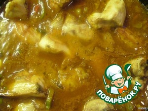 В готовый соус выкладываем отдохнувшую курочку, тушим на небольшом огне минут 25-30, пробуем на соль.