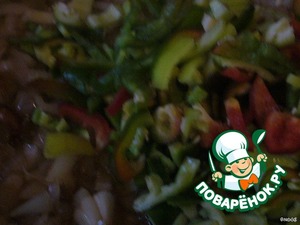 К луку добавляем порезанный соломкой сладкий перец, томатную пасту, сахар, специи и бульон, перемешиваем и тушим минут 10 на среднем огне соус.