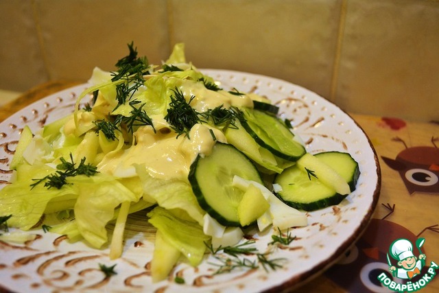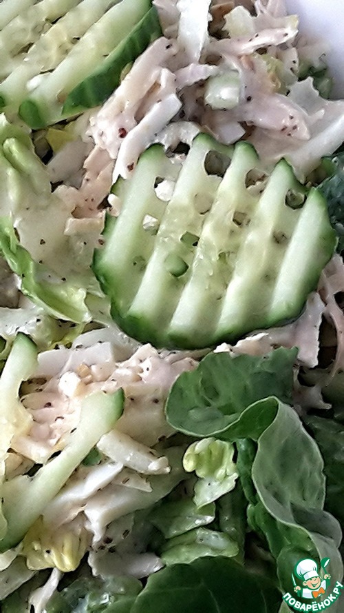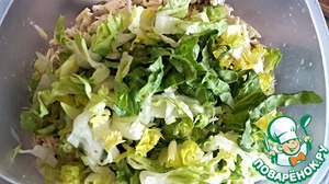Перед подачей добавляем в салат 80 г нарезанных ленточками листьев салата. Салат лучше брать хрустящий - предпочтительней всего латук (у меня на фото) или "Айсберг". Оба эти сорта долго сохраняют товарный вид и остаются хрустящими.